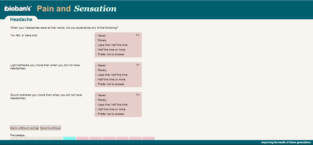 Online pain questionnaire screenshot of questions E5e-E5g, showing appearance as seen by participants circa 2019.