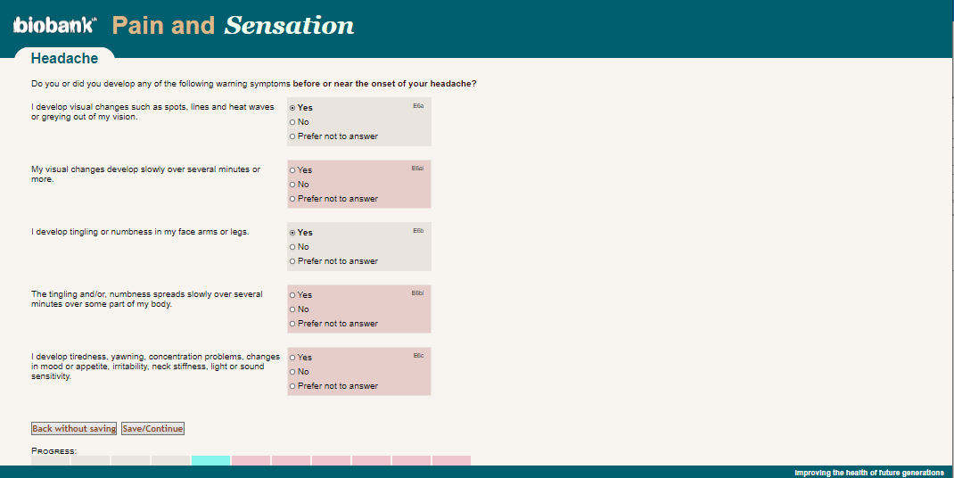 Online pain questionnaire screenshot of questions E6ai-Ebi, showing appearance as seen by participants circa 2019.