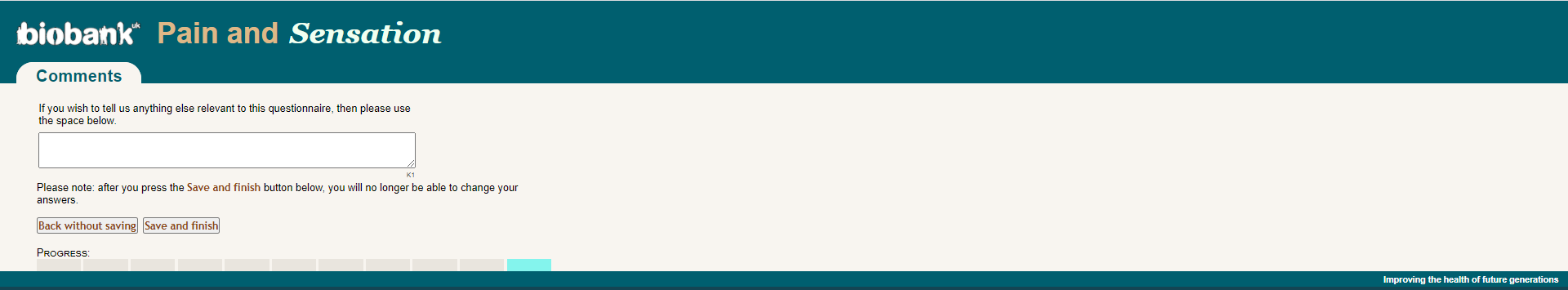 Online pain questionnaire screenshot of final comment question, showing appearance as seen by participants circa 2019.