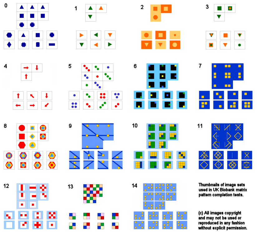 This image is a montage containing reduced size copies of the 15 images (indexed 0-14) used in the matrix pattern recognition test. The thumbnails are 20% of the original bitmap pixel resolution.