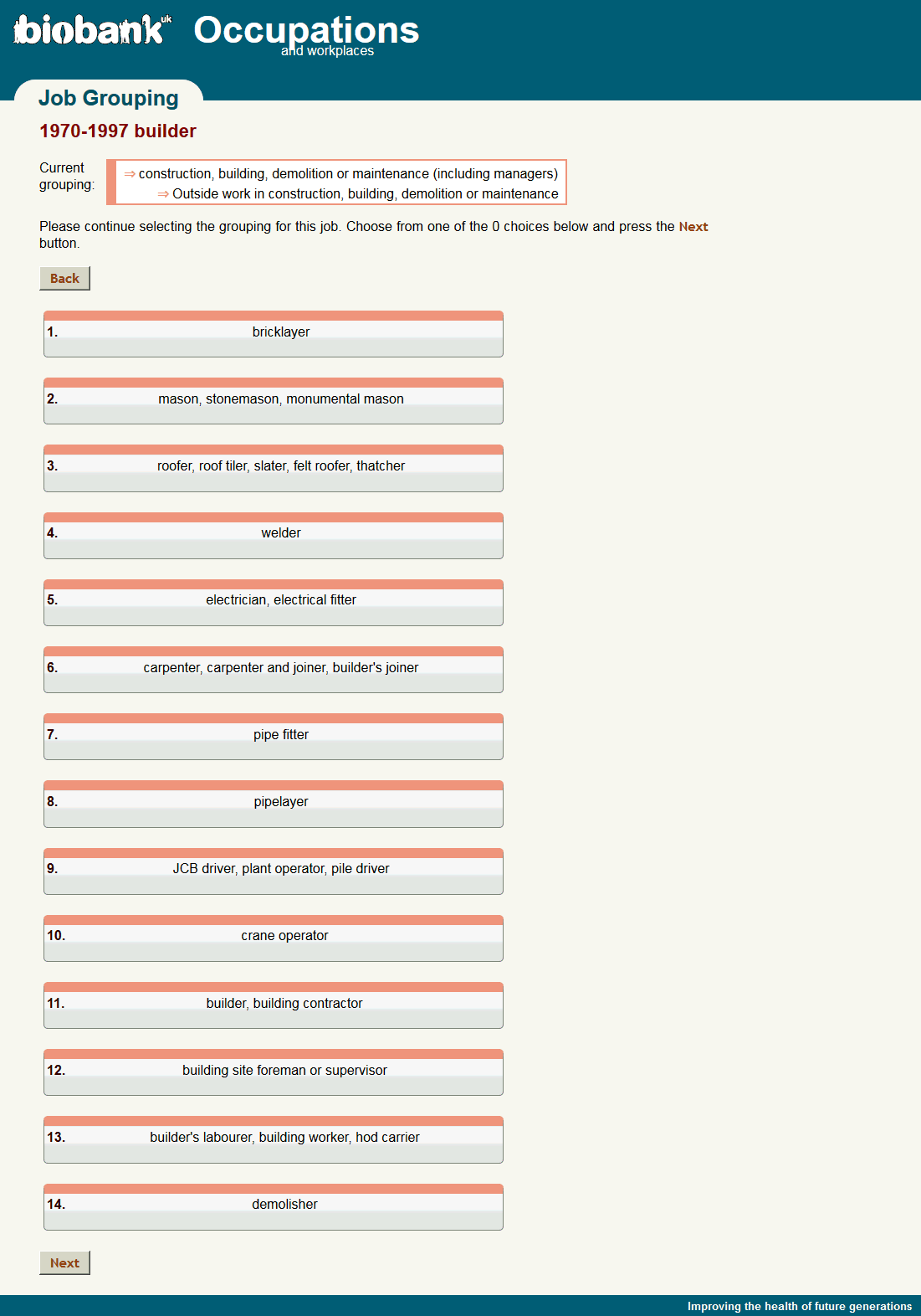 Web screenshot from Occupational questionnaire showing intermediate screen used by participants to self-code a job.