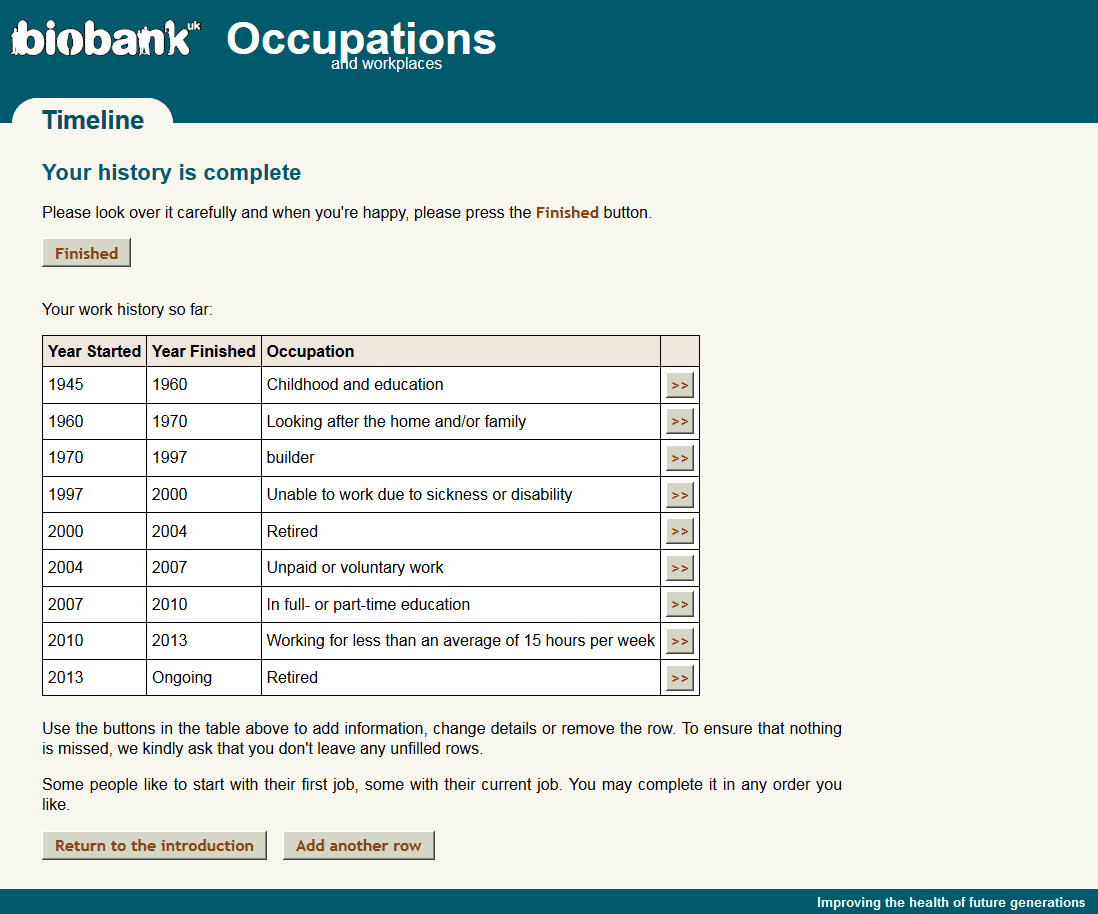 When users had entered a list of jobs and gaps which covered the complete period between finishing education and the present they were presented with this screen to review (and edit if necessary).
