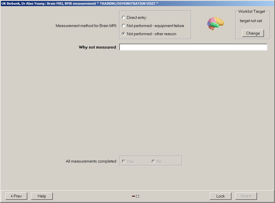 This shows the screen within the ICE system into which staff input a reason for the brain MRI measurement not being conducted.