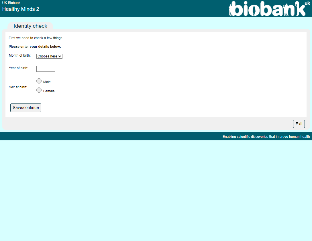 An iniital identity check screen was presented to verify that the person entering was the correct participant. This was primarily targetted at participants who shared an email address with other participants and therefore might enter data for the wrong person if the email invite (which contained an initial and family-name) was not read fully. Version shown is from 2021 implementation.