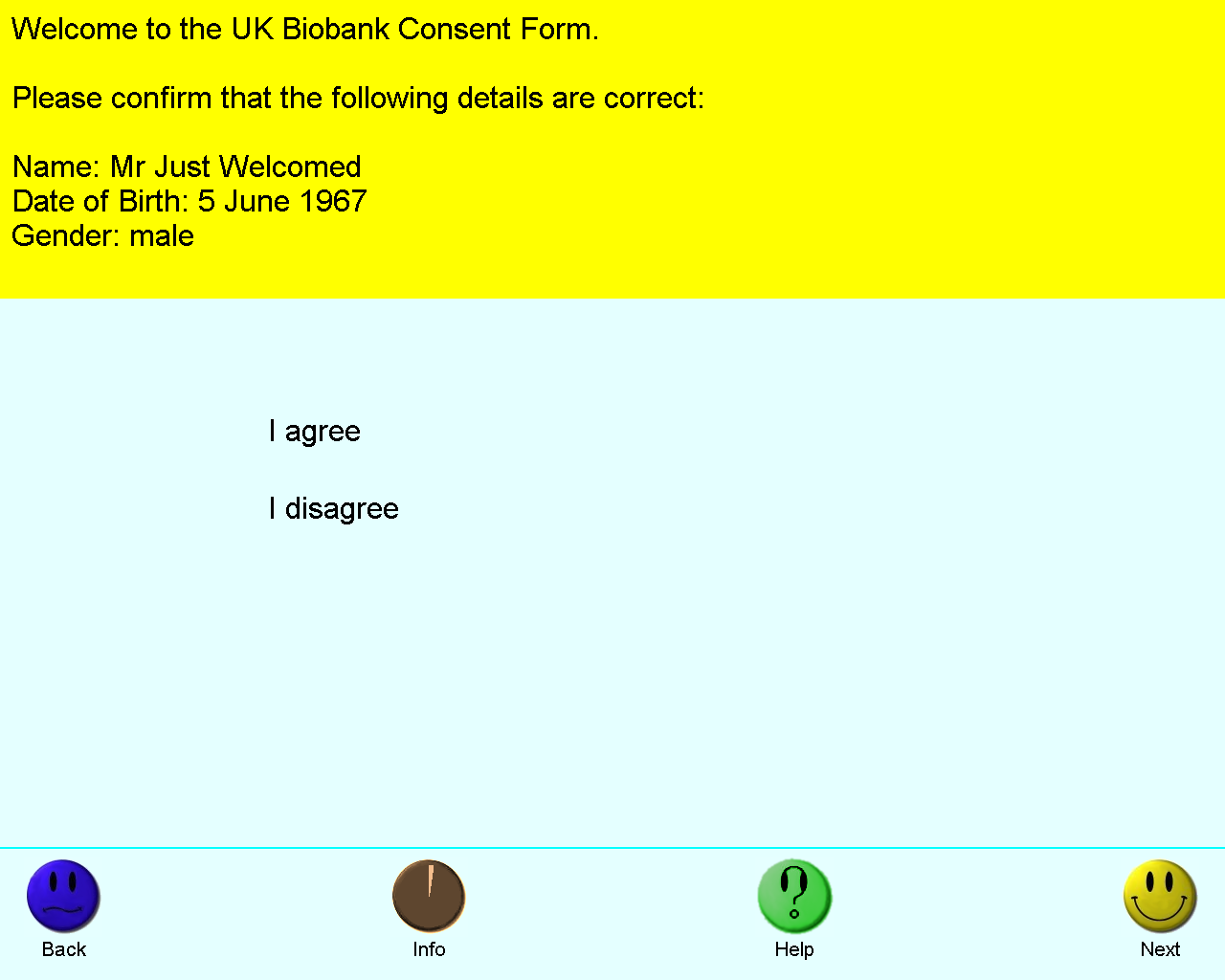 The second screen of the consent process displayed the participants identifying information and required them to confirm it is correct before proceeding. If the participant indicated some or all of the information is incorrect then a staff member would be summoned to assist.