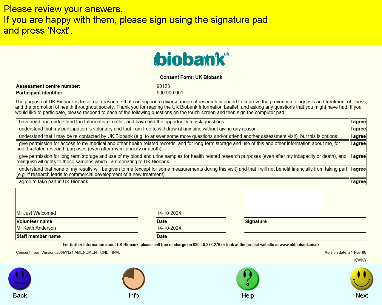 After answering the seven consent question positively the participant is shown a draft of their consent form and invited to add their signature.