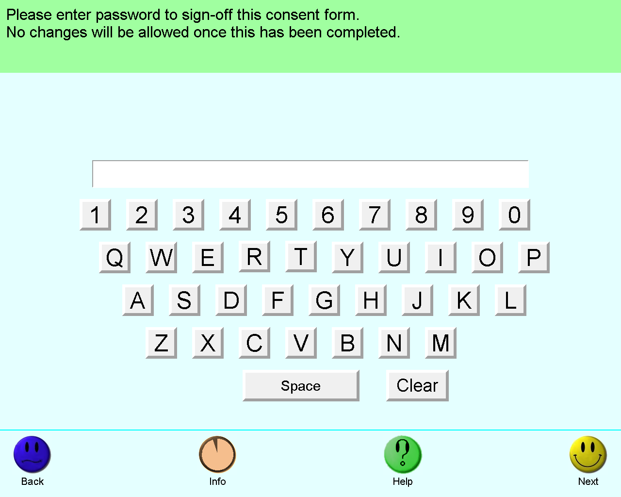 Having recorded their identity the UKB staff member witnessing consent entered their password to prove their identity.