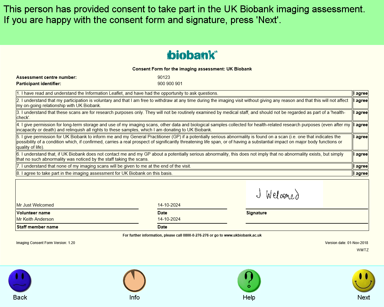 This screen is shown to a UK Biobank staff member (in the presence of the participant) who checks the signature is good and that the participant is happy with the final result.