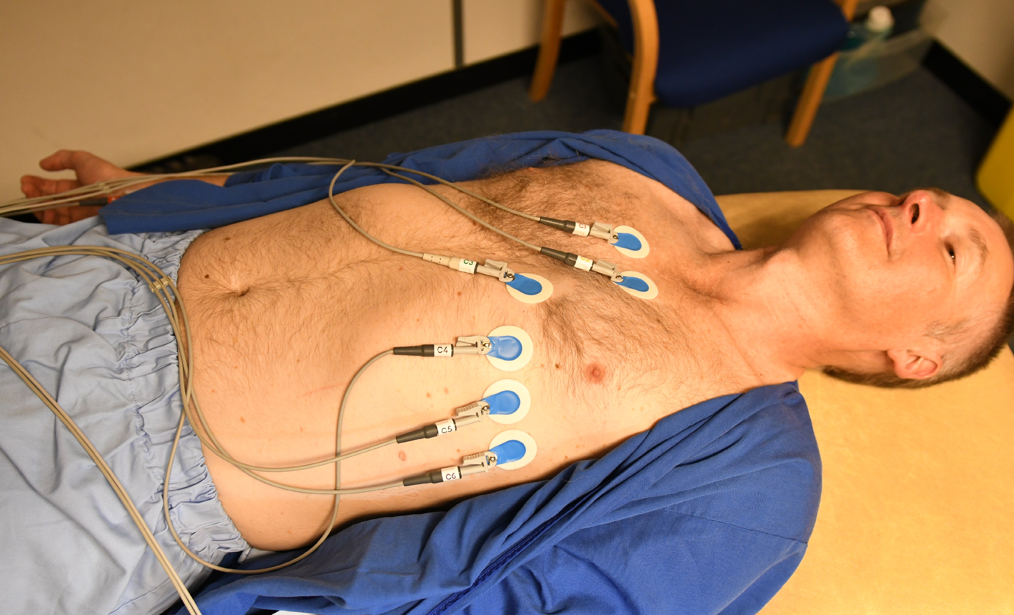 Participant shown with chest connections in place ready for the 12-lead ECG measurement. Some areas of chest have been shaved to improve connectivity.