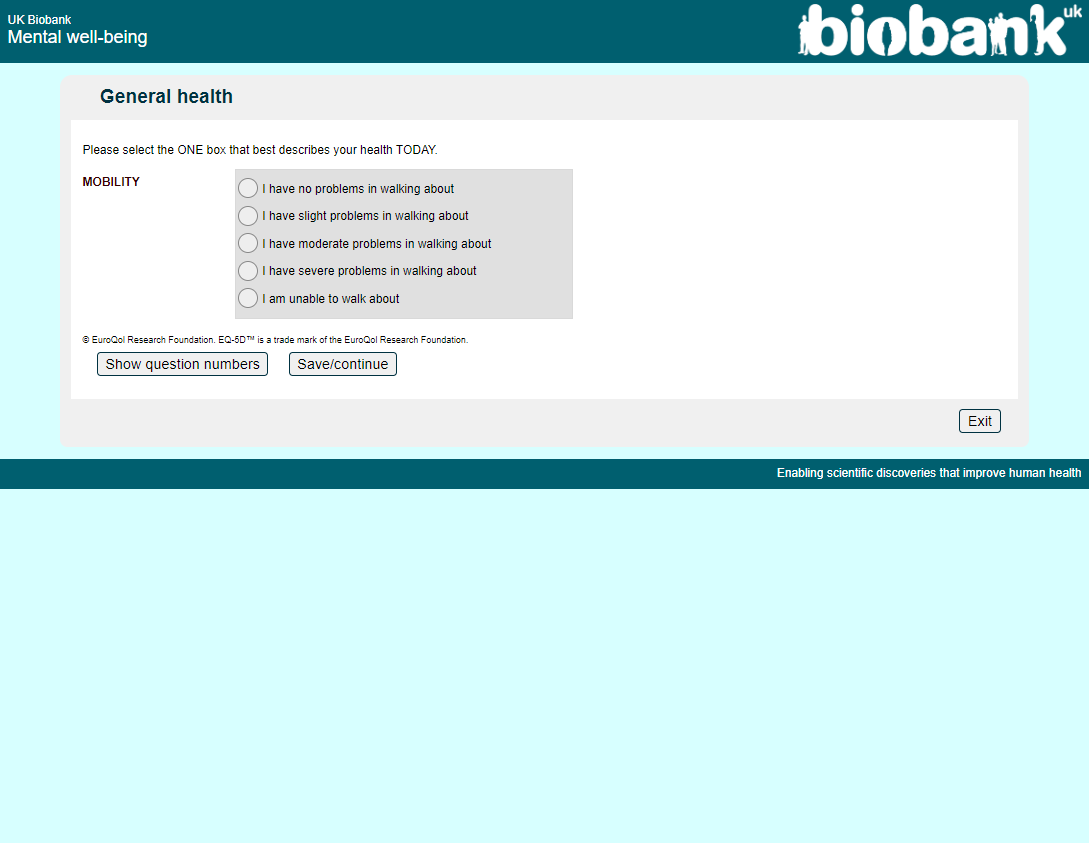 Online mental wellbeing questionnaire screenshot EQ5D5L1a, showing appearance as seen by participants circa 2022