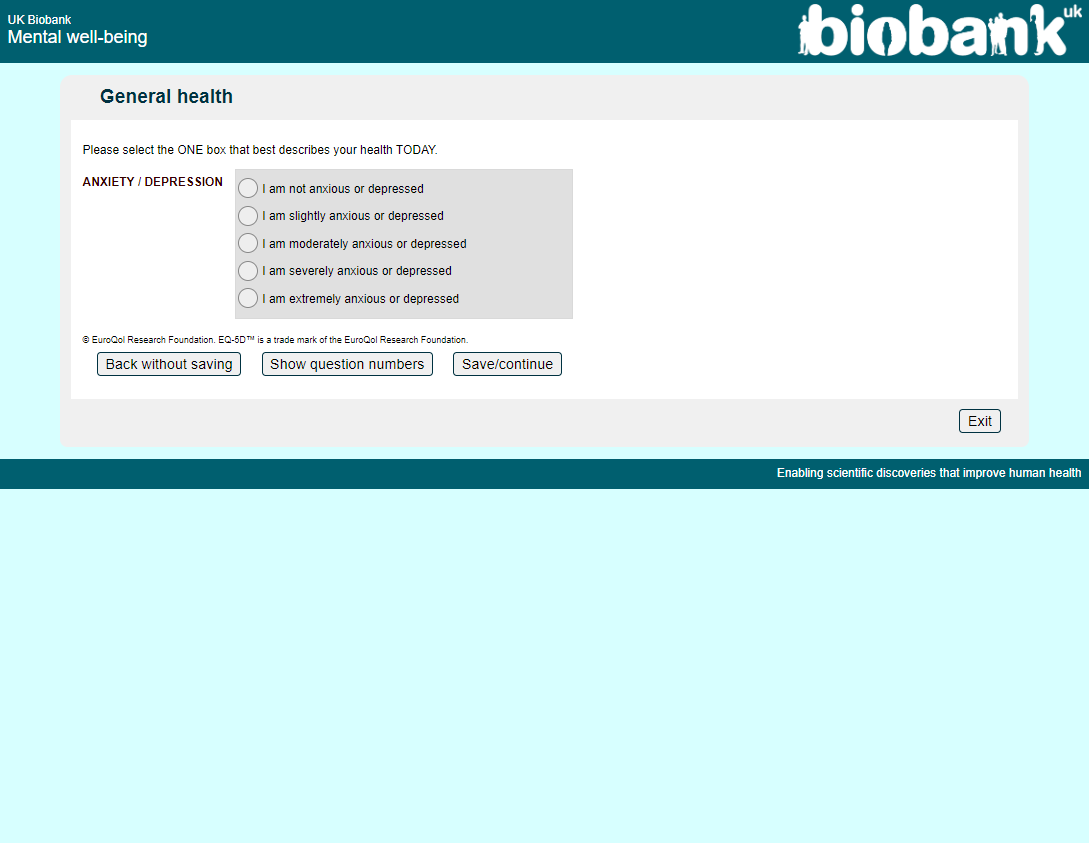 Online mental wellbeing questionnaire screenshot EQ5D5L1e, showing appearance as seen by participants circa 2022