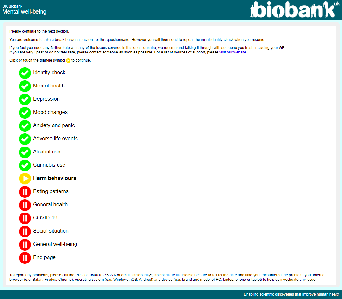 Online mental wellbeing questionnaire screenshot of menu when cannabis use module completed, showing appearance as seen by participants circa 2022