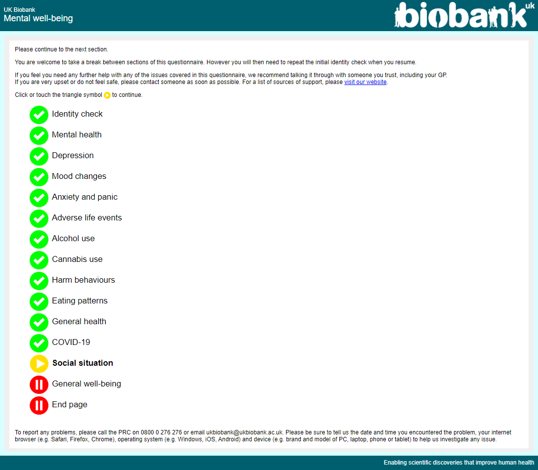 Online mental wellbeing questionnaire screenshot of menu when COVID-19 module completed, showing appearance as seen by participants circa 2022