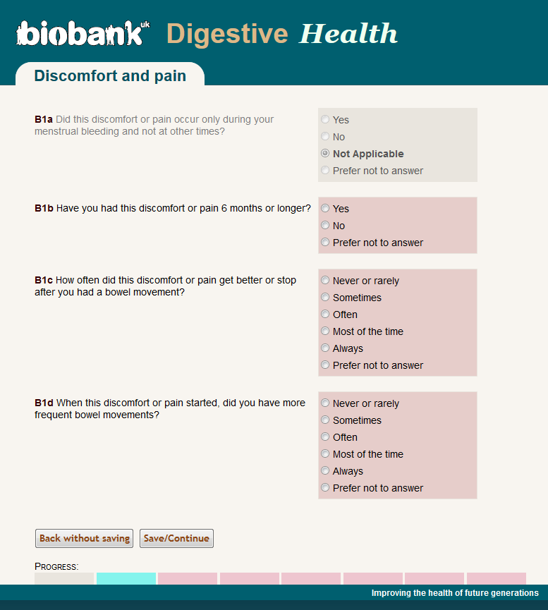 Online digestive health screenshot of question b1a for male participants (automatically marked as not-applicable) , showing appearance as seen by participants using a large-screen web-browser circa 2017.