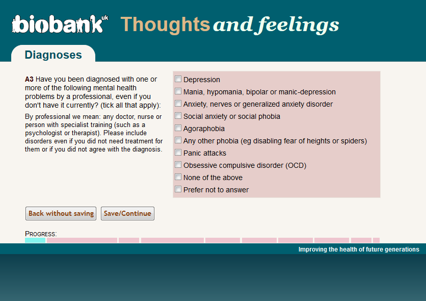Screenshot of web-page for professionally diagnosed conditions (group 1/2) from the UK Biobank on-line "Thoughts and Feelings" mental health questionnaire