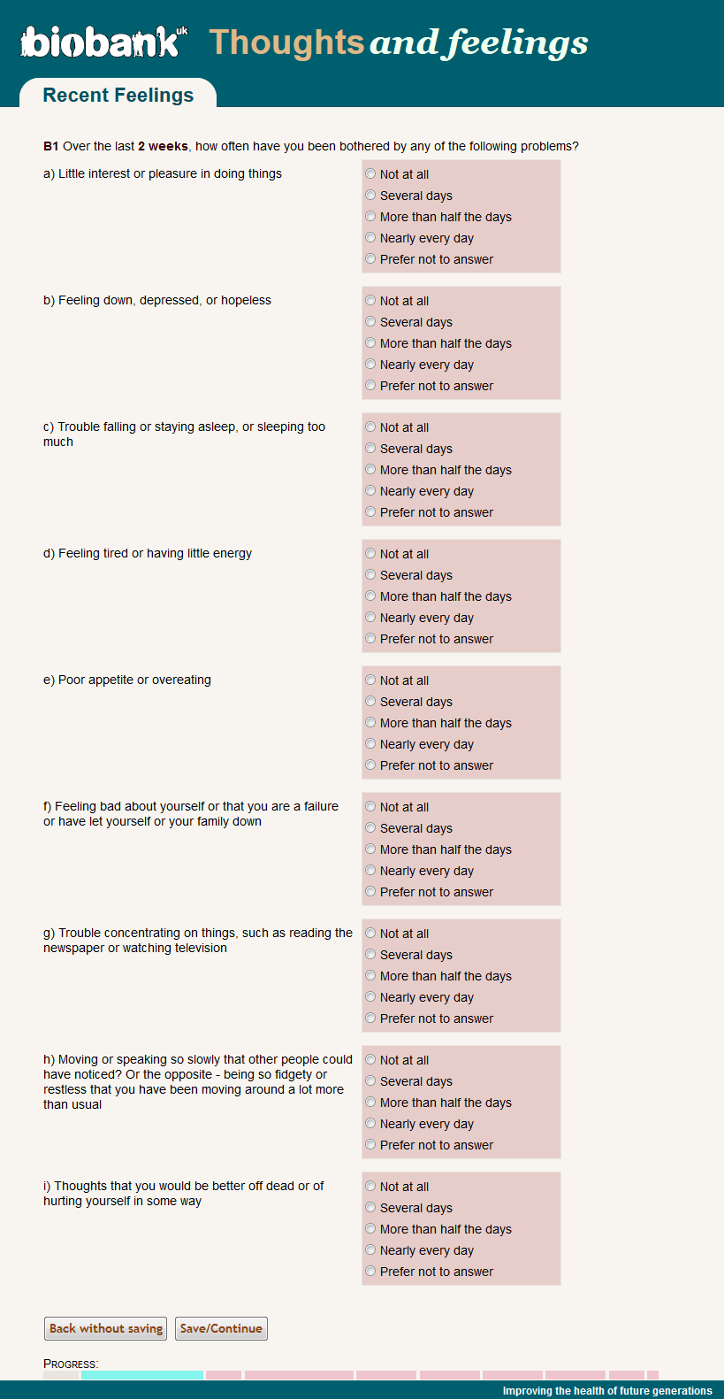 Screenshot of web-page for depression in last 2 weeks from the UK Biobank on-line "Thoughts and Feelings" mental health questionnaire