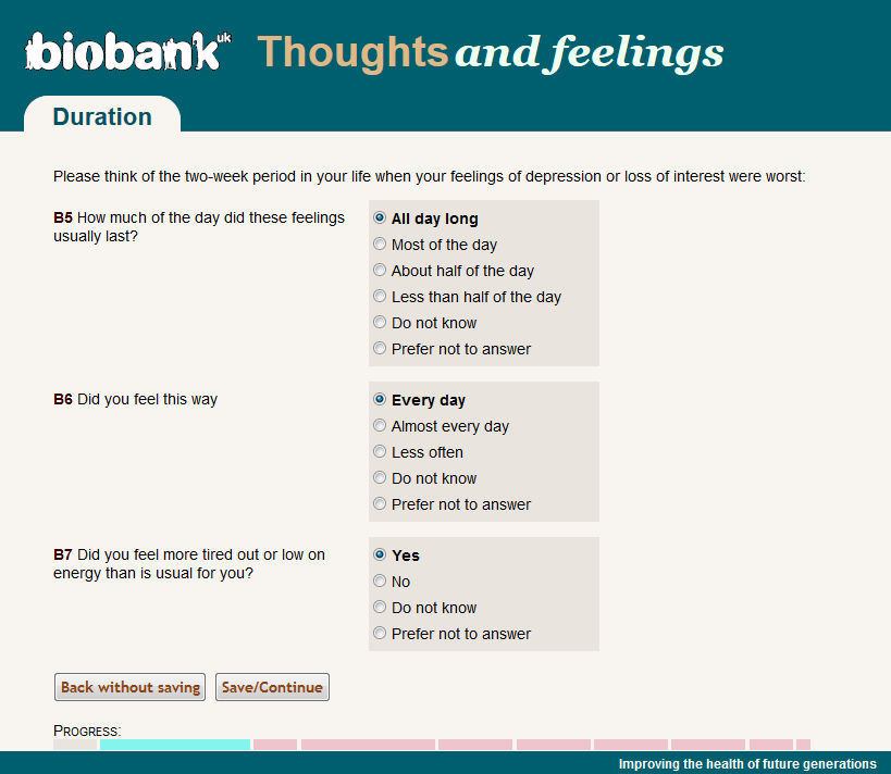 Screenshot of web-page for worst depressed period symptoms from the UK Biobank on-line "Thoughts and Feelings" mental health questionnaire