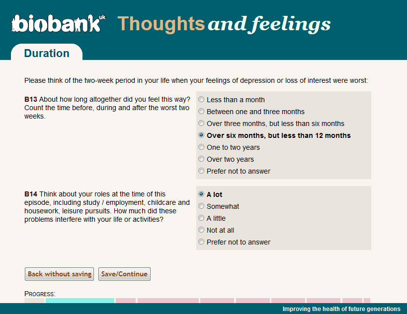 Screenshot of web-page for duration and effect on role during worst depression from the UK Biobank on-line "Thoughts and Feelings" mental health questionnaire