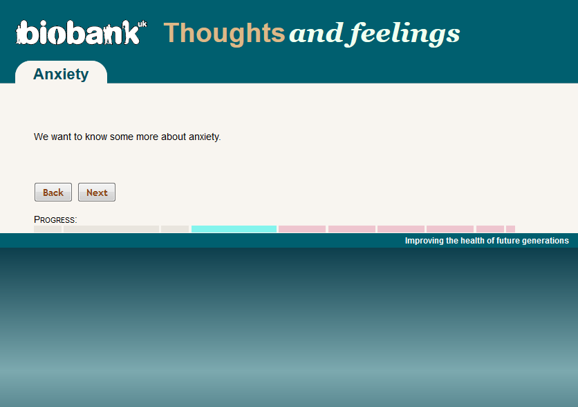 Screenshot of web-page for introduction to anxiety section from the UK Biobank on-line "Thoughts and Feelings" mental health questionnaire