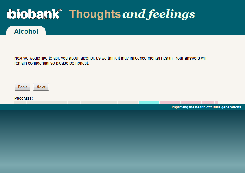 Screenshot of web-page for introduction to alcohol section from the UK Biobank on-line "Thoughts and Feelings" mental health questionnaire