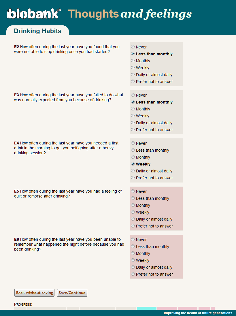 Screenshot of web-page for consequences of alcohol from the UK Biobank on-line "Thoughts and Feelings" mental health questionnaire