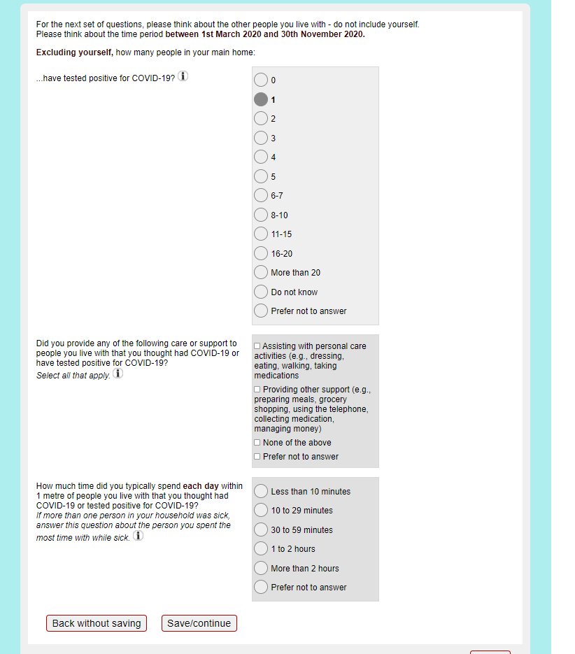 Online SARS-CoV-2 coronavirus exposure questionnaire screenshot of question B7-B8