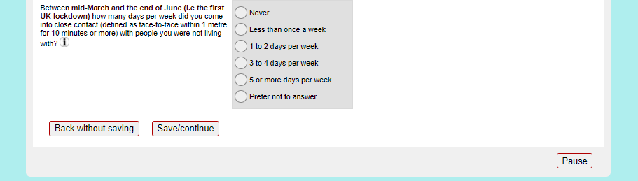 Online SARS-CoV-2 coronavirus exposure questionnaire screenshot of question C14 for March-June