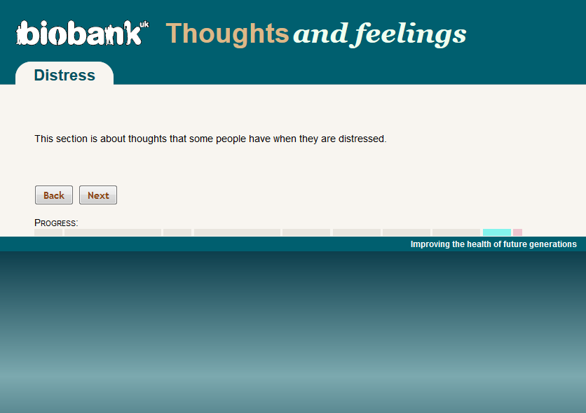 Screenshot of web-page for introduction to distress section from the UK Biobank on-line "Thoughts and Feelings" mental health questionnaire