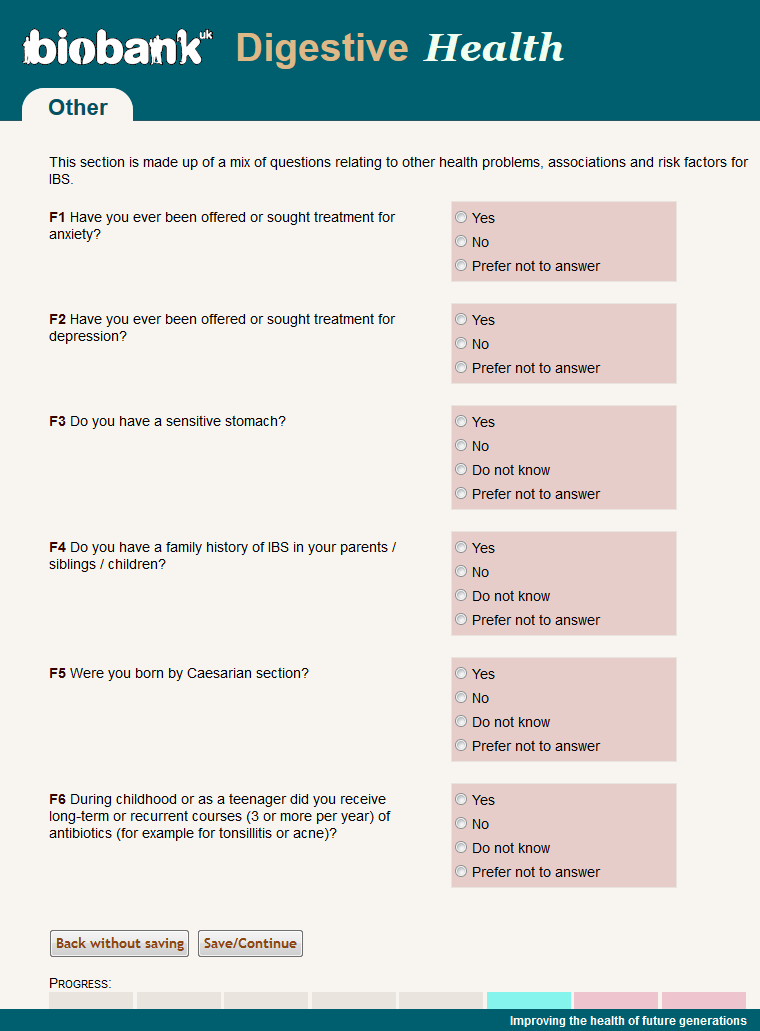 Online digestive health screenshot of questions f1-f6, showing appearance as seen by participants using a large-screen web-browser circa 2017.
