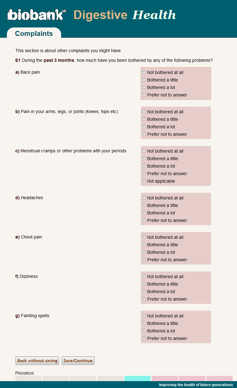 Online digestive health screenshot of questions e1a-e1g, showing appearance as seen by participants using a large-screen web-browser circa 2017.