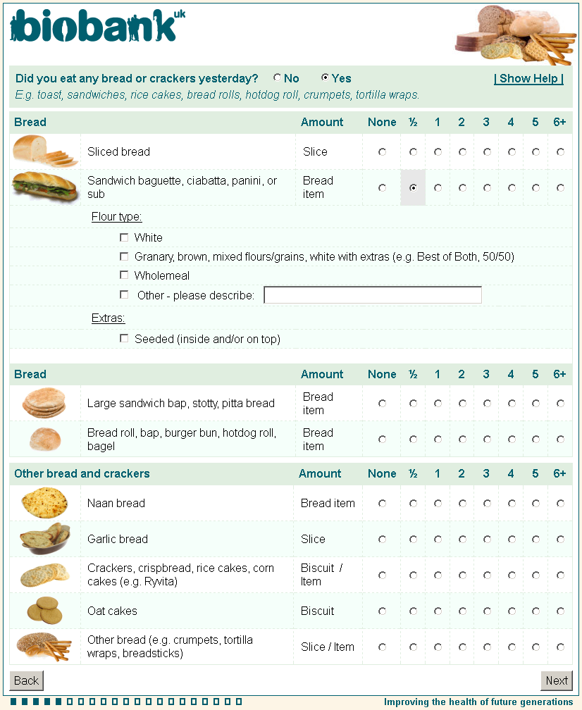 Online diet questionnaire screenshot wd0070, showing appearance as seen by participants using a web browser circa 2011.