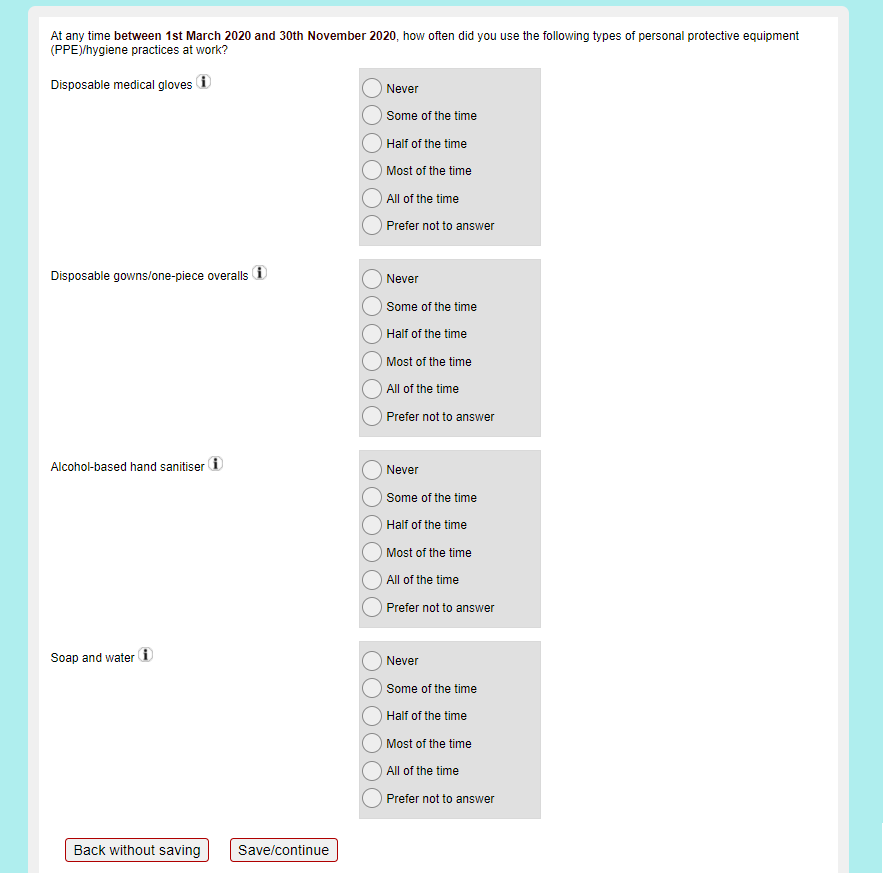 Online SARS-CoV-2 coronavirus exposure questionnaire screenshot of question C8.5-C8.8
